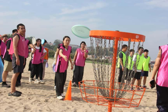 热身活动结束后,真正的挑战接踵而至。6个队伍重新整合,划分为2个小组,每组包含三队,一场紧张刺激的游戏较量正式打响。本次拓展活动精心设置了四个趣味与挑战并存的项目,分别是“飞盘九宫格”“飞盘掷准”“飞盘投篮”以及“飞盘保龄球”。