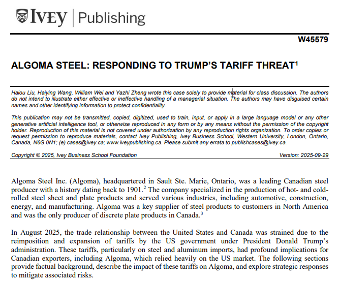 刘海鸥教授撰写的案例《Algoma Steel: Responding to Trump’s Tariff Threat》(案例编号:W45579)正式被国际顶尖商学案例库——加拿大毅伟商学院案例库收录入库,并面向全球168个国家超过25000个学院和教师出版发行。这是河北省首篇被海外知名案例库收录的教学案例,标志着我校在国际教学案例开发和建设工作取得了新突破!